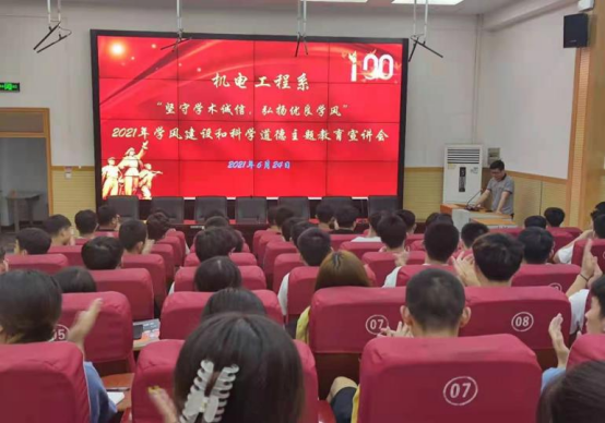 值此中国共产党成立100周年之际,为深入学习贯彻中国科协、教育部《关于开展科学道德和学风建设宣讲教育活动的通知》,弘扬爱国、创新、求实、奉献、协同、育人的科学家精神,强化崇尚学术民主、坚守科研诚信底线、反对学术不端的价值共识,提升学生思想政治教育的针对性和实效性,6月24日晚,机电工程系在北教三阶开展以“坚守学术诚信,弘扬优良学风”为主题的2021年科学道德与学风建设主题教育宣讲会,机电工程系党总支副书记王远志、全体辅导员、团学干部及各班学生代表参加会议。