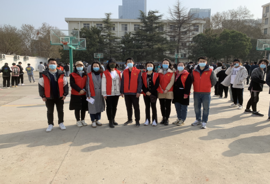 在核酸检测现场,志愿者们身穿红色马甲,一方面维持现场秩序,保证核酸检测有序进行;另一方面,帮助医护工作者扫码登记,采集信息,和医护工作者同坚守、共担当,切实为学院筑牢疫情“防护网”。