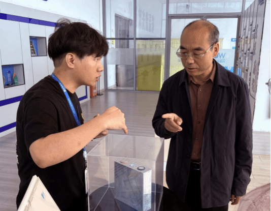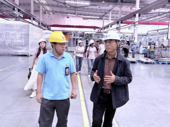 随后,调研团队深入企业总装车间进行实地参观。整洁有序的生产环境、高度自动化的装备生产线、严谨细致的工艺流程给老师们留下了深刻印象,双方就生产技术、工艺创新、人才需求等方面进行了现场交流。