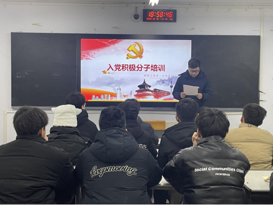 12月13日晚,机电工程系组织2023年第一期入党积极分子在南教203上党课。学生支部书记王远志以《党员发展流程讲解》为题,围绕党员发展的全过程,从申请入党,入党积极分子的确定和培训教育,发展对象的确定和考察,预备党员的接收,预备党员的教育、考察和转正五个部分展开,由点到面由浅入深为大家详细讲解了发展中共党员的各项步骤,让学员们了解了党员发展的标准流程与严谨要求。他希望学员们要始终保有一颗纯粹的心、始终坚持进行持续性思考、始终把握思想淬炼和实践历练的机遇,端正入党动机、铸就纯粹党性,在思想上真正入党、组织上按期入党、行动上早日入党。