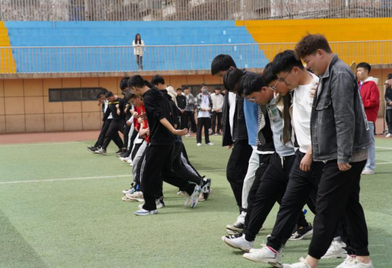比赛中,每队7人为一组站成一排,所有学生的腿都绑在一起,各位队员之间紧紧抱住肩膀,随着裁判一声令下,大家共同喊着口号、迈着一致的步伐,相互协作配合,尽管途中摔倒但站起来调整好状态后继续向前跑去,直到冲向终点的那一刻,大家通红的脸上洋溢着灿烂的笑容。大家凭借身体的协调力、同学之间默契的协作配合、互相鼓励整齐的口号,参与的学生们斗志昂扬,展现了良好的意志品质。
