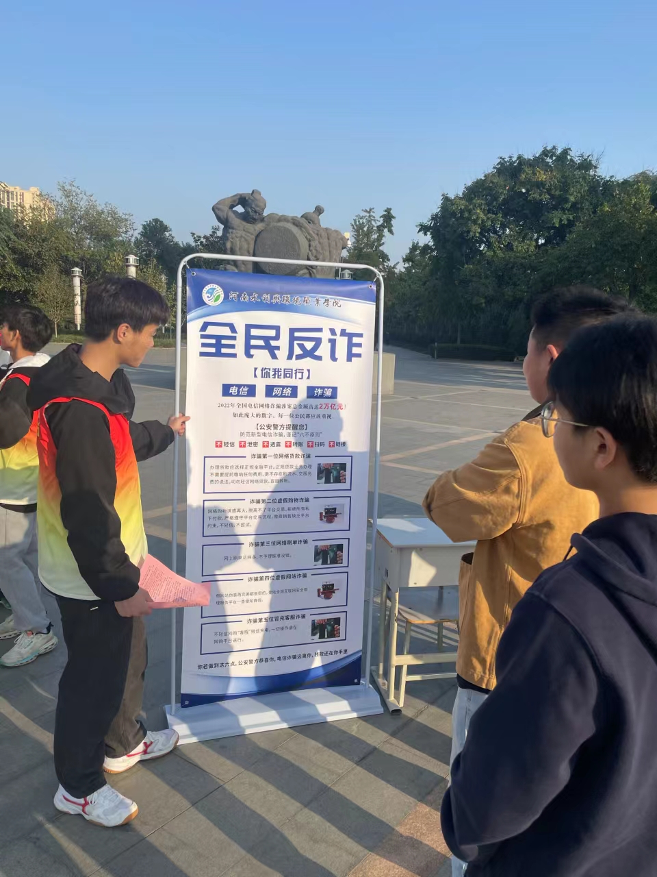 当前,电信网络诈骗犯罪已经成为发案量最多、涉及面最广、人民群众反映最强烈的犯罪类型,严重侵害了群众切身利益,侵蚀了社会诚信根基,影响了社会和谐稳定。为进一步提升群众反诈意识和识骗防骗意识,加大普法宣传力度,营造全民反诈的浓厚氛围和安全稳定的社会环境,11月7日机电工程系团总支组织20名青年志愿者到郑州市金水区融园社区和东风渠滨河公园开展“全民反诈,你我同行”反诈宣传社会志愿服务活动。