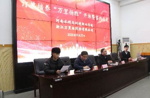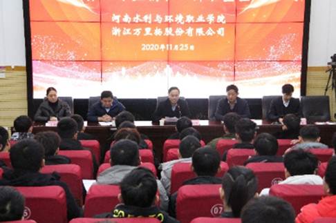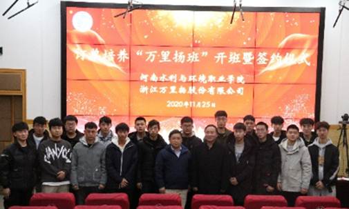 11月25日下午,机电工程系与浙江万里扬股份有限公司在北教三阶成功举办了2020级订单培养“万里场班”开班暨签约仪式。河南水利与环境职业学院副院长黄功学教授,河南水利与环境职业学院副院长蒋彦成,浙江万里杨股份有限公司人力资源部部长晋心武,机电工程系党总支书记王建军,机电工程系主任王利卿,机电工程系党总支副书记王远志,机电工程系副主任李戈以及机电工程系全体辅导员和2020级参与订单班的全体同学出席了本次开班暨签约仪式.