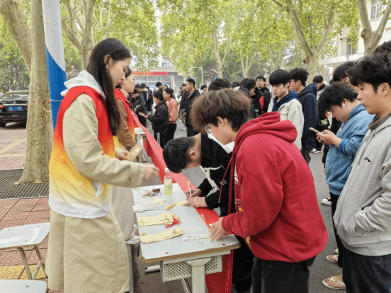 游园会聚焦“沉浸式感知传统”,设置三大特色互动板块,让文化体验更具新意。“老物件记忆卡”区陈列着搪瓷杯、旧挂历、老式收音机等老物件卡片,同学们通过观察卡片细节、猜测物件用途,在怀旧氛围中学习卡片背后的时代故事与重阳相关习俗;“重阳诗句拼贴”区提供乱序的经典重阳诗句卡片,大家分组协作拼接诗句,在动手过程中加深对重阳诗词的记忆;“祈福签书写”区摆放着祈福书签与圆珠笔,同学们亲手书写对家人、朋友的祝福以及对未来的期许,将写满心意的祈福签悬挂在梧桐树绳架上,营造出浓厚的节日氛围。