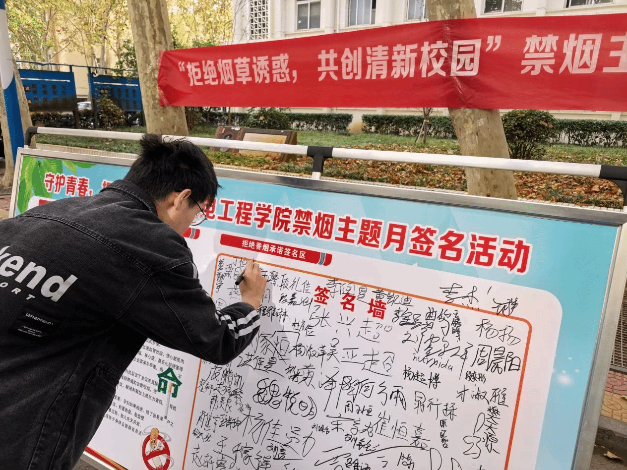 11月10日至14日,天使大道活动现场氛围热烈,丰富多样的宣传形式吸引了大批同学驻足参与。图文并茂的宣传展板前,同学们认真研读烟草危害科普知识,从呼吸系统损伤到心血管疾病风险,从个人健康代价到环境破坏影响,详实的内容让大家对烟草危害有了全方位认知。在醒目的签名区,同学们郑重提笔签下自己的姓名,一笔一划间不仅承载着对健康生活的向往,更传递着支持无烟校园建设的坚定决心。学生志愿者们化身“健康宣传员”,围绕展板内容细致讲解烟草对人体健康、生态环境的多重负面影响,同学们还主动分享对无烟生活的见解,进一步强化了健康认知。活动结束后,签名展板继续在天使大道路边陈列展览两日,持续扩大宣传覆盖面,让禁烟理念深入人心。