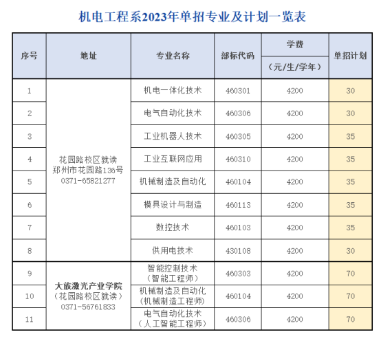 机电工程系2023年单招专业及计划一览表